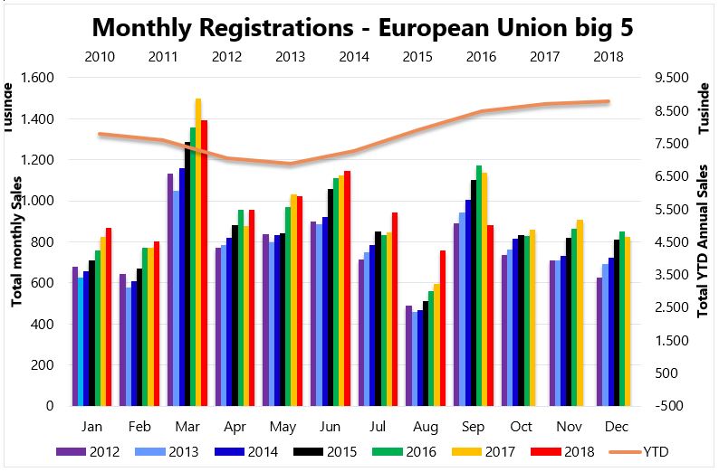 At the end of the first half of 2018, the Big 5 were up 1.0% although this was mainly due to the drag caused by the decline in the UK car market. However, the move to WLTP for all new cars registered since September 2018 saw a flurry of day registrations or pre-registrations across Europe.