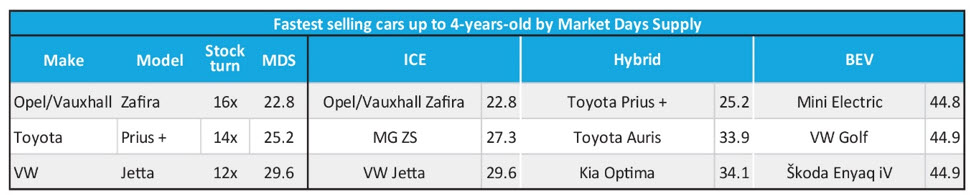Europe’s overall fastest-selling used car was the Opel/Vauxhall Zafira, followed by the Toyota Prius+ and Volkswagen Jetta. The Zafira also took the accolade of the fastest-selling ICE.