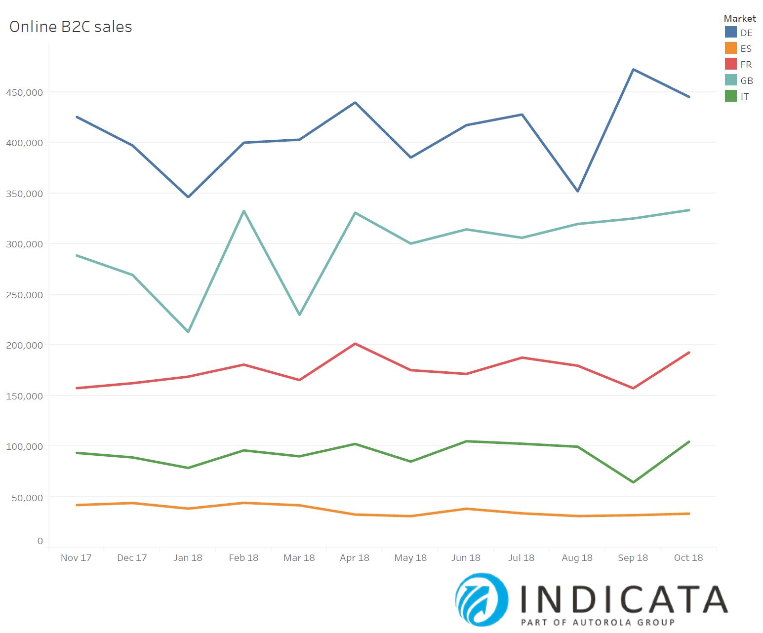 Following the drop in September, new car sales for first three quarters of the year for the Big 5 are up 0.8%. At a country level Spain is still seeing the strongest growth up 11.5% after nine months, followed by France up 6.5% with Germany third as sales growth is now just 2.4%. The political turmoil in Italy has seen sales go into reverse with total sales for the first three quarters of 2018 now down 3.0% over the same period last year; whilst the UK new cars sales continue to drop sharply with sales now down 7.5%.