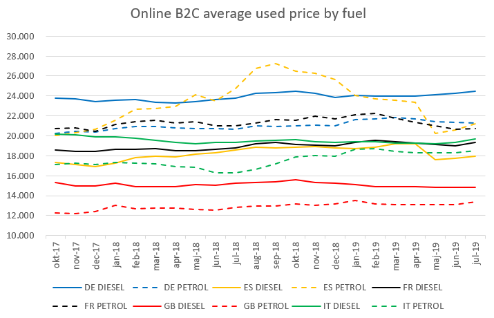 Average online B2C used diesel car prices are also up in France (+3.1%) for Q2 2019 compared to the same period last year. Whilst used diesel car values have remained almost flat in 2019 with just a 0.2% increase from January to July the situation for average online B2C used petrol car prices follows a similar but more severe pattern to what is happening in Germany, dropping 6.4% in seven months.