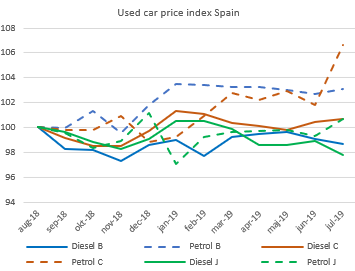 Whilst both the B and C segments in Spain have shown healthy increases in the average used petrol prices for cars, the situation for J segment petrol SUVs is far less dramatic.