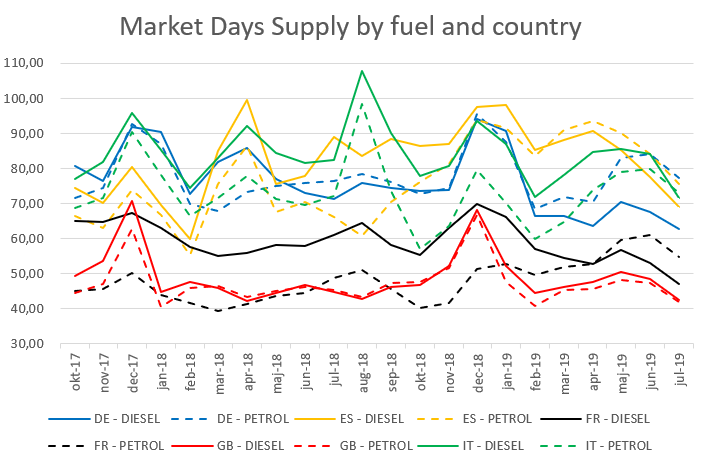 France has seen MDS fall by 17.7% between January and June this year with MDS dropping from 61.77 days in January for the whole market to just 50.84 days by July 2019. Drilling down further into INDICATA’s data shows the French used dealer market seems to be handling the move to petrol from diesel in a more controlled fashion than Germany. Used petrol car MDS in France has increased by 4.2% since January 2019 and 12.4% since July 2018. In July 2019 it stood at 54.78 days whilst used diesel car MDS has dropped 28.7% since January and 22.8% down over the previous year and now stands at 47.09 days – a gap of just over seven days between both fuel types compared to over 14 days’ worth of stock in Germany.