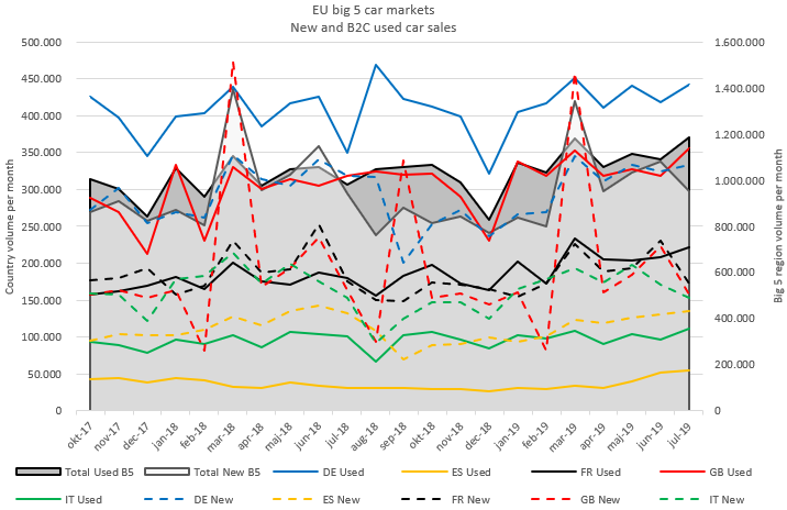 Over the first seven months of 2018 online B2C used car sales were achieving parity with sales of new cars across Europe’s five largest car markets, with 7.14 million new cars registered compared to 7.15 million used car sales. One year later and used car sales are now 10% higher than new car sales with 7.74 million online B2C used cars sold in the first seven months of 2019 versus 7.01 million new cars over the same period.