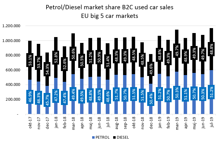Four of the five largest car markets saw a shift in market share from diesel to petrol of between 2.3% (Germany) and 3.4% (Spain) with the UK seeing a 2.5% switch and France a 2.8% movement between the two fuels. Italy continues to be the exception with 469,502 online B2C used diesel car sales recorded by INDICATA for the first seven months of 2019, a 4.7% increase over the same period in 2018 and increasing the diesel used car market share from 68% over that period last year to 68.3% this year. This is clearly why so many German used car dealers are seeing Italy as a good place to export their unwanted older diesel cars.