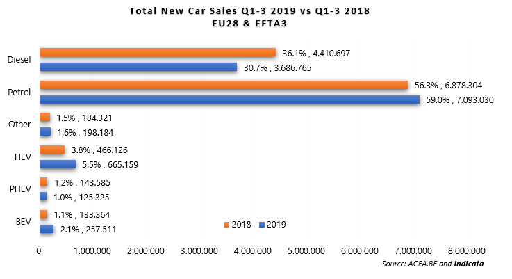 In the first 9 months of 2019 Battery Electric Vehicle (BEV) sales grew in Europe by 93.1% but this still equates to just 2.1% of the total new car market. Hybrid vehicles have also grown by a healthy 42.7% in the first half of 2019 and now account for just over 5.5% of new car sales.