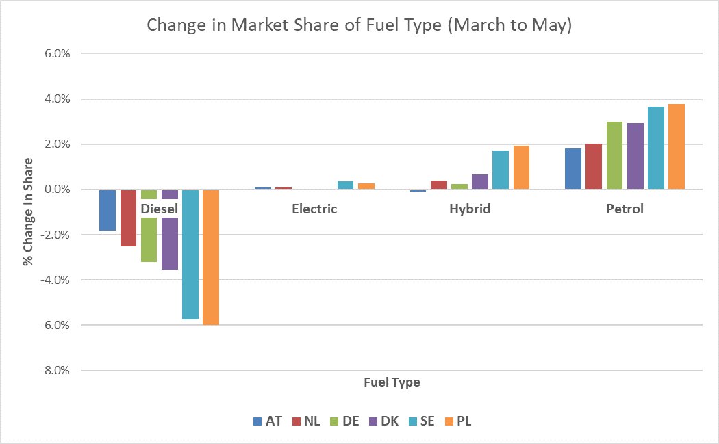 One noticeable trend is the growth in popularity of used petrol, hybrid and electric cars at the expense of diesel over the past two months. All six countries on their recovery phase have seen a growth in petrol used cars. In Germany the swing from petrol to diesel was 6.2% and in Poland 9.8%. Sweden meanwhile has experienced a 30%+ growth in hybrid and electric volumes versus a 2% reduction in sales across its entire market.